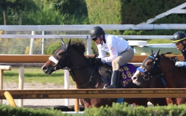 今朝29日はレースへ向けた2週前追い切り。2回目のハローが終了して、しばらく時間が経った頃に正面から入場。ポルトドール(古馬1勝クラス)の後ろ、1秒半から2秒ほどの間隔をあけたところから追走していたが、行きたがるなどの素振りはない。