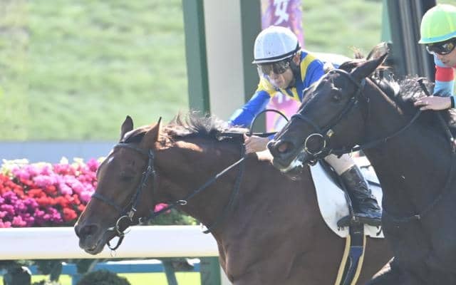 1日、京都競馬場5Rで行われた新馬戦(2歳・芝2000m・9頭)は、好位追走から直線で内を突いて先頭に立った北村友一騎手騎乗の2番人気シャドウマスター(牡2、栗東・杉山晴紀厩舎)が、先に動いて最後も差し返してきた1番人気サリエンテ(牝2、栗東・池添学厩舎)にハナ差をつけ優勝した。勝ちタイムは2分02秒3(稍重)。