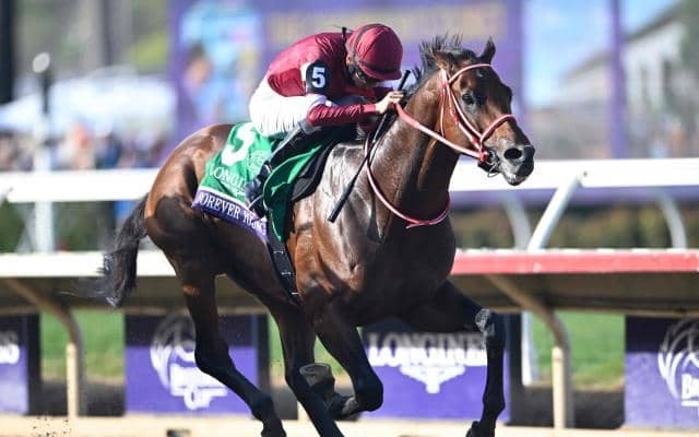 日本時間2日、アメリカのデルマー競馬場で行われたブリーダーズカップクラシック(3歳上・G1・ダ2000m)は、坂井瑠星騎手騎乗の1番人気フォーエバーヤング(牡4、栗東・矢作芳人厩舎)が優勝。道中は2番手に構え、3-4コーナーで先頭に立つと、直線では外から迫る2番人気シエラレオーネ(牡4、米・C.ブラウン厩舎)を振り切った。勝ちタイムは2分0秒19。