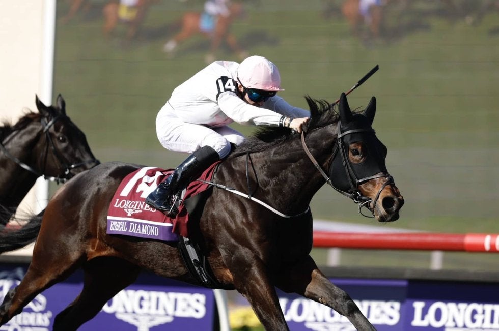 現地時間11月1日、アメリカ・デルマー競馬場で行われた、ブリーダーズターフ(G1・芝2400m)は、D.マクモナグル騎乗、平地障害の二刀流エシカルダイヤモンド(せん5・W.マリンズ)が波乱を巻き起こした。勝ちタイムは2:25.45(良)。