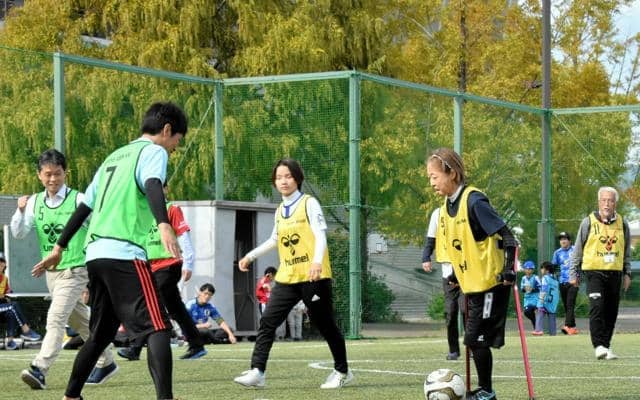 ウォーキングフットボールでは、早歩きや体の接触、ヘディングなどができない。年齢や性別、障害の有無に関わらず、一緒に楽しめる。地域貢献と、多様性や人権について考える機会として企画され、今年が2回目。