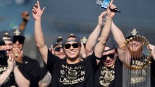 優勝セレモニーのスピーチでファンを盛り上げた山本由伸(C)Getty Images 2年連続でワールドシリーズを制覇した…
