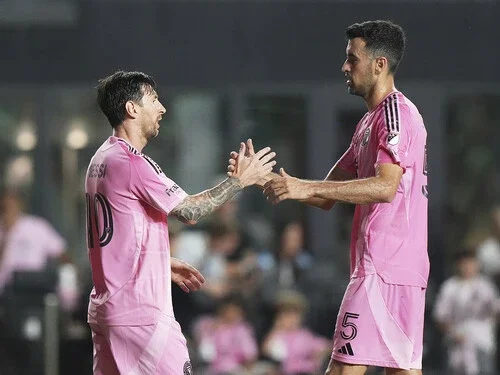 インテル・マイアミのチームメイト、リオネル・メッシと手を取り合うセルヒオ・ブスケツ photo by AP/AFLO
