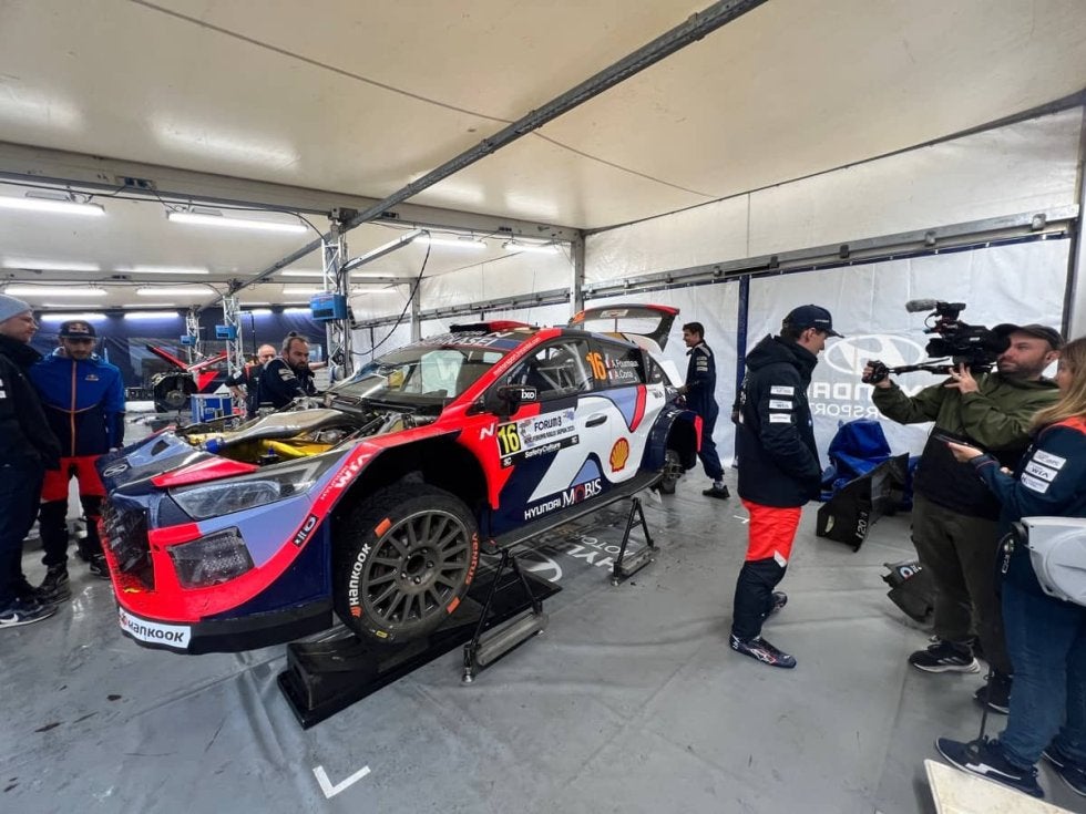 WRCラリージャパン、SS15『Nukata(20.23km)』で立木にボディ右サイドをヒットし、コ・ドライバー側のドアを失う大ダメージを負い、ステージフィニッシュ後にリタイアとなったヒョンデのアドリアン・フルモー。豊田スタジアムのサービスに戻ってから、状況を説明した。