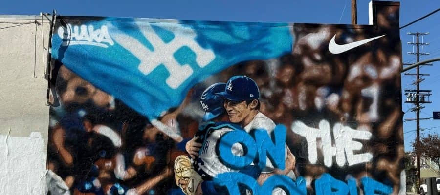 スポーツ用品メーカー「ナイキ」のLA専門インスタグラムは9日(日本時間10日)、「ダブルプレーを決め、連覇を決めた。この街のために」と綴って公開したのは、ロサンゼルス市内に新たに作った広告壁画だ。佐々木とウィル・スミス捕手が勝利の瞬間に抱き合う場面やハイタッチ、マックス・マンシー内野手、ブレイク・スネル投手らが描かれている。