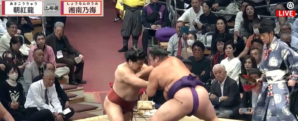 大柄力士と小兵力士――いずれも“いいカラダ”同士の注目の一番は、前頭十五枚目・湘南乃海(高田川)が前頭十七枚目・朝紅龍(高砂)を上手出し投げで下して2勝目を挙げた。