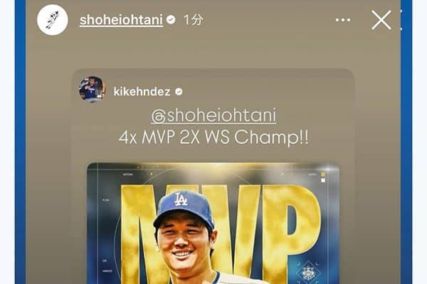 大谷が掴んだ新たな栄誉にドジャースナインも次々に反応。ミゲル・ロハス内野手はインスタグラムのストーリーズに祝福のメッセージを添えてMVP受賞画像を公開。エンリケ・ヘルナンデス外野手も「4x MVP 2X WS Champ!!」と4度目のMVPとワールドシリーズ連覇を祝う言葉を綴りストーリーズで大谷の快挙を祝った。大谷はストーリーズで“リポスト”する形で祝福に応えていた。