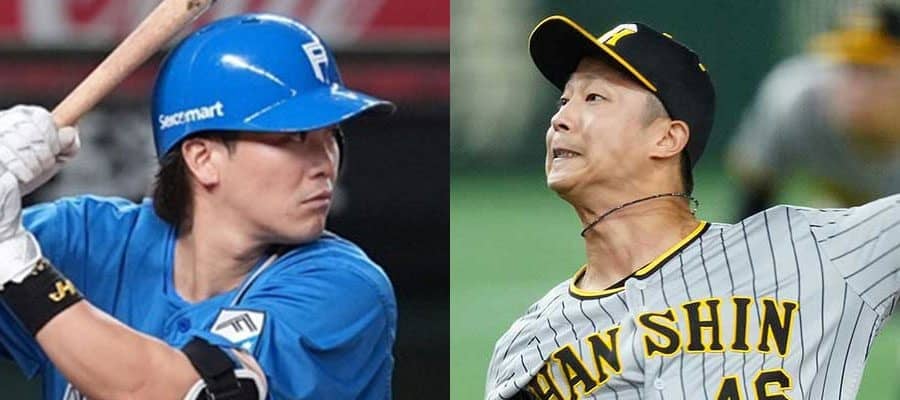 日本ハム・伏見寅威(左)と阪神・島本浩也【写真:小林靖、矢口亨】