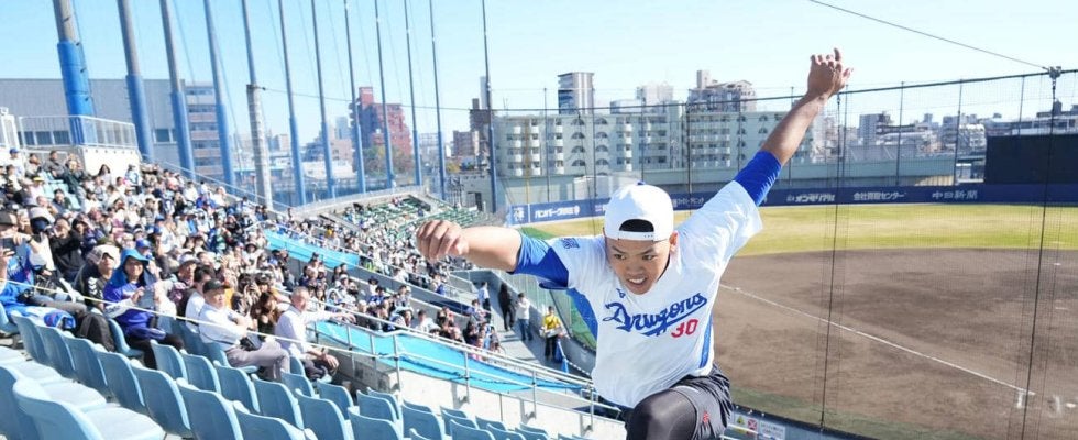 一塁側スタンド前ではメディシンボールを使った強化トレーニング、三塁側はダッシュ、そしてバックネット裏では階段登りを3グループに分かれて行った。特に近い階段登りでは「根尾くん頑張れ!」の声援が飛ぶたびに根尾昂投手(25)は振り向いて「頑張ります!」「ありがとうございます!」と返事をし、客席は盛り上がった。