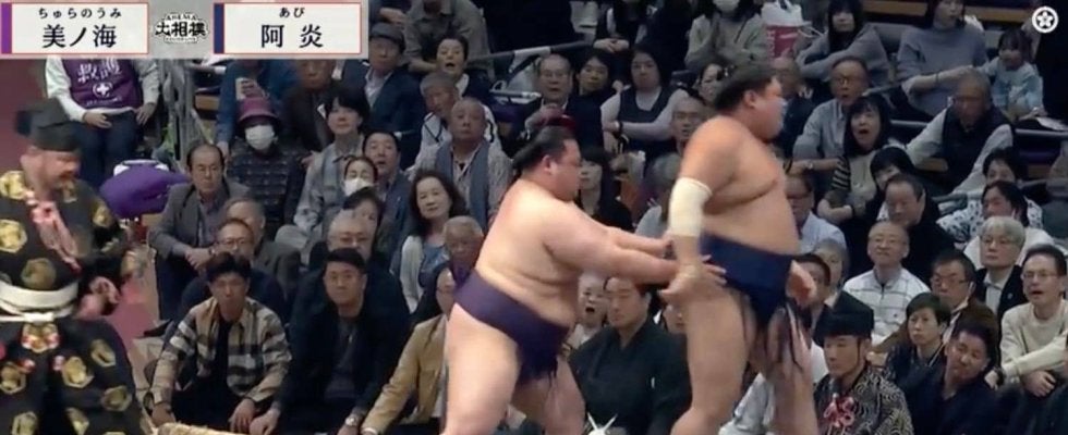 前頭七枚目・美ノ海(木瀬)が前頭七枚目・阿炎(錣山)を送り出して4勝目を挙げた一番。館内は大きく盛り上がったが、一方で美ノ海が白星を上げた直後、客席では残念な行為が発生……これを受け、ファンから「退出させろ」「如何なものか」などと批判の声が上がった。