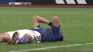 日本代表MFの久保建英がハプニングに見舞われた。相手の肘が顔面付近に入ると、その場で大の字となり一時的に動けなくなってしまった。