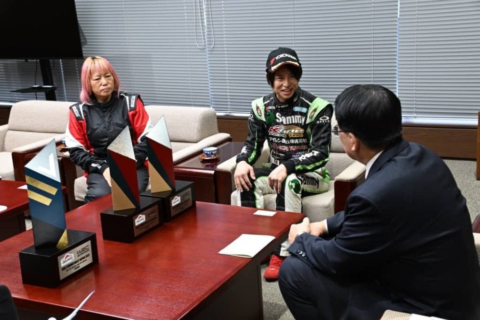 フォーラムエイト・ラリージャパン2025ではナショナル部門が設定されており、JR1、JR2、JR3、RC5クラスに6台の日本人勢が参戦。ナショナル部門JR2クラスで優勝したK-ONE RACING TEAMのドライバー山本悠太と、JR1クラスで優勝したTEAM BRIDEのコ・ドライバー内田園美が優勝報告のため岡崎市の内田康宏市長を訪問した。