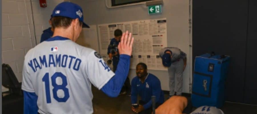 山本由伸投手は今季、ポストシーズンで獅子奮迅の大活躍。リーグ優勝決定シリーズ第2戦とワールドシリーズ第2戦では9回1失点にまとめ、2試合連続の完投勝利を記録した。そんな中、佐々木朗希投手らが“土下座ポーズ”する写真が大きな話題を集めた。ドジャース地元放送局「スポーツネット・ロサンゼルス」はその“裏側”を公開している。