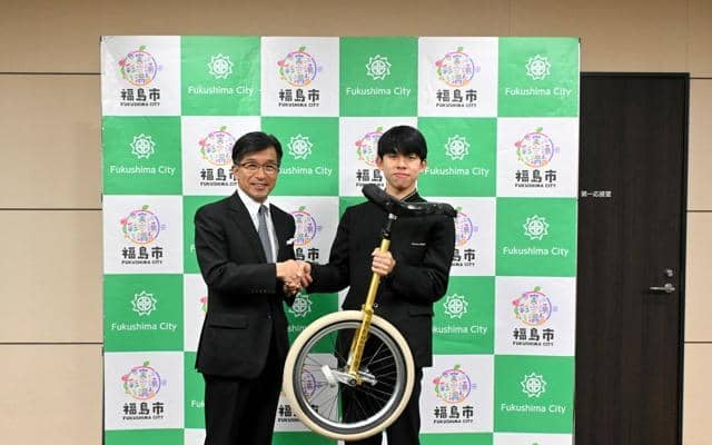 佐藤選手は母の菜花(さいか)さんが監督を務める余目一輪車クラブで小学1年から一輪車競技を始めた。全日本大会出場は2020年から6年連続。市長の励ましに「とても参考になり、ありがたい」と話した。