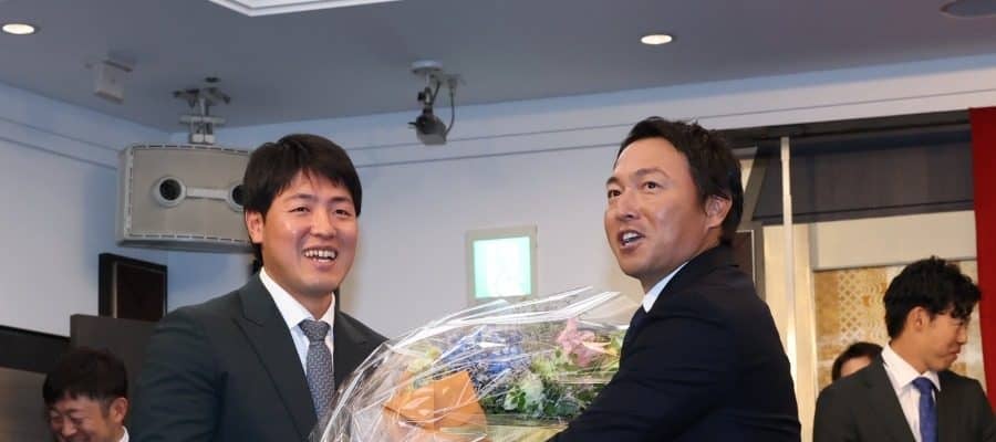 スピーチが終わると、場内を1周。その後、ナインが胴上げの準備をしていたが、長野が岡本のことを呼び出した。岡本も今オフにポスティングシステムでメジャー挑戦。巨人退団はほぼ確実となっている。