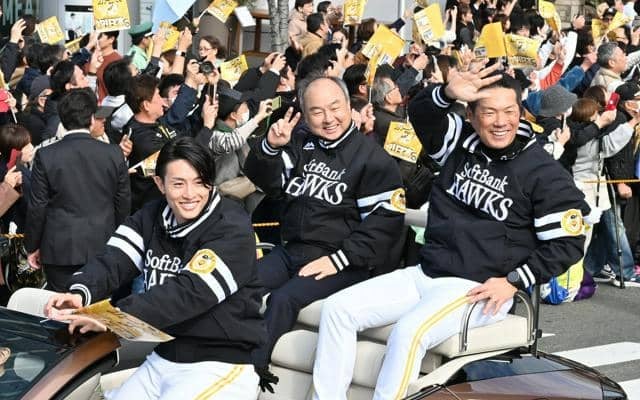 日本一優勝祝賀パレードで声援に応える(左から)ソフトバンクの周東佑京選手、孫正義オーナー、小久保裕紀監督=2025年11月24日午前11時15分、福岡市博多区、日吉健吾撮影