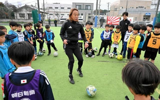 サッカー元日本代表の北沢豪さん(57)から指導が受けられる「ジュニアサッカースクール」(朝日新聞社、千葉北部朝日会主催)が23日、千葉県柏市藤ケ谷新田の「BOATI(ボアッチ) sports(スポーツ) park(パーク)」であった。抽選で選ばれた小学1~3年生約100人が、楽しく学んだ。
