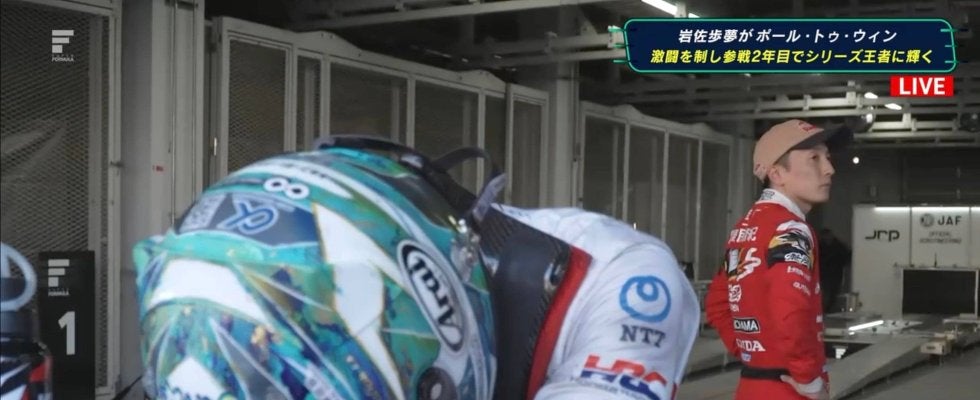 野尻は前日22日の第11戦決勝で16戦ぶり今季初優勝を飾るなど、苦しいシーズンを乗り越えてきた。最終戦では僚友の岩佐を援護する脇役に徹したが、元王者としての振る舞いが感動を呼んだ。太田を労った直後、野尻は信憑な面持ちで立ち尽くしたが、直後に優勝したチームメートの岩佐が現れると抱き合い、喜びを分かち合った。