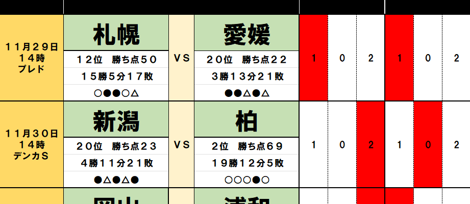 今回のtotoはJ1第37節の10試合と、J2第38節の3試合が対象となっている。過去のデータや直近の様子などから、分…