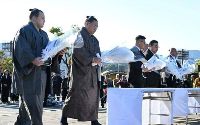 大相撲のウクライナ出身の新大関・安青錦(21)らが29日、長崎市の平和公園を訪れ、平和祈念像の前で献花した。