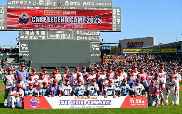 プロ野球・広島東洋カープの往年の名選手45人が参加した「カープレジェンドゲーム」が29日、マツダスタジアムであった。2万7550人が訪れ、スタンドからは当時の応援歌が響くなど懐かしい時間が流れた。