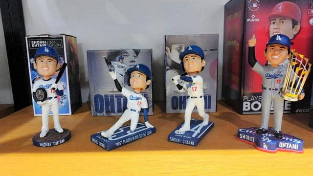 会場では、ドジャースなど人気チームのユニホームやTシャツなど約300種類を販売。世界で1万体限定の大谷選手のミニボブルヘッド人形(税込み1万3200円)が特に売れ筋という。そのほか、ドジャースの主力5選手が実際に使用したバットを手に取り、重さなどを体験できるコーナーや、大谷選手の等身大パネルと撮影できるフォトスポットも設けられている。