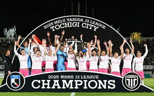 サッカーJ3の栃木シティは29日、相模原市の相模原ギオンスタジアムでSC相模原を5―0で破り、初優勝を飾った。前節にJ…