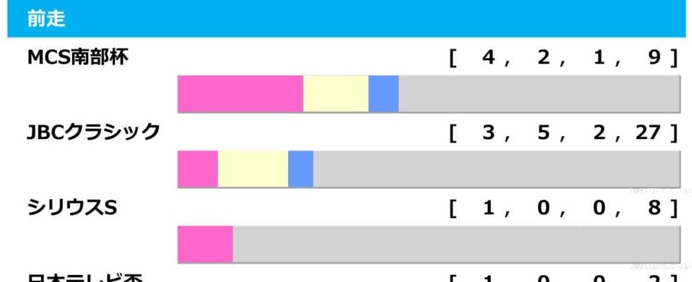 MCS南部杯【4.2.1.9】 JBCクラシック【3.5.2.27】 シリウスS【1.0.0.8】 日本テレビ盃【1.0.0.2】 JBCレディスC【1.0.0.3】 武蔵野S【0.2.0.23】 みやこS【0.1.5.28】 JBCスプリント【0.0.1.2】 セントライト記念【0.0.1.0】