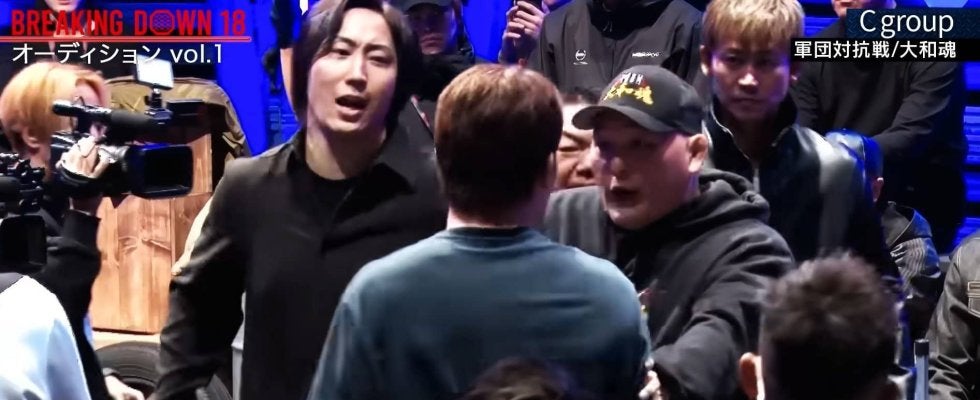 そこに大和魂のメンバーが加わり、事態は徐々に混沌としてくる。見かねたエンセンが収拾のタイミングを伺うべく黙って話を聞いている後ろから、何やら影が迫る。過去、ブレイキングダウン「出禁」にもなったことがある問題児、レオだ。
