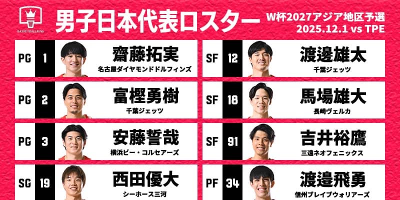 11月30日、日本バスケットボール協会(JBA)は、翌12月1日に開催される「FIBAバスケットボールワールドカップ2027アジア地区予選Window1」チャイニーズ・タイペイ代表(FIBAランキング67位)戦に臨む男子日本代表(同22位)のロスター12名を発表した。