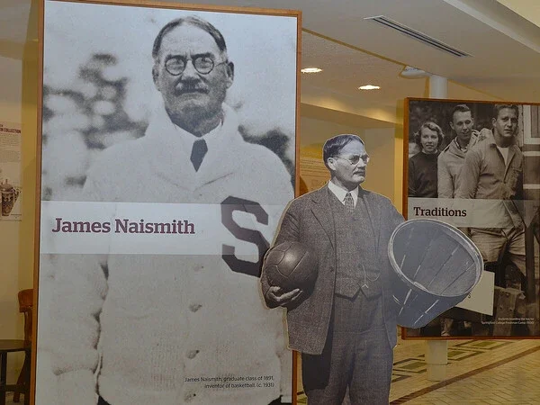 カレッジに着いて向かったのはスティッツァーYMCAセンター。1894年に開館し、カレッジで最古の建物であるジャッド体育館の中がセンターになっている。YMCAの歴史に関わる文献や史料を収集した「YMCAの殿堂」では、ネイスミスの等身大の写真などが展示されていた。