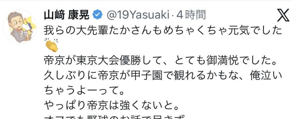 投稿では「我らの大先輩たかさんもめちゃくちゃ元気でした。帝京が東京大会優勝して、とても御満悦でした。久しぶりに帝京が甲子園で観れるかもな、俺泣いちゃうよーって。やっぱり帝京は強くないと。オフでも野球のお話で尽きず…今年も帝京会を開催出来た事ここにご報告させて頂きます。そして改めて原口さんお疲れ様でした(原文ママ)」とつづり、石橋の近況や再会の喜びを伝えた。