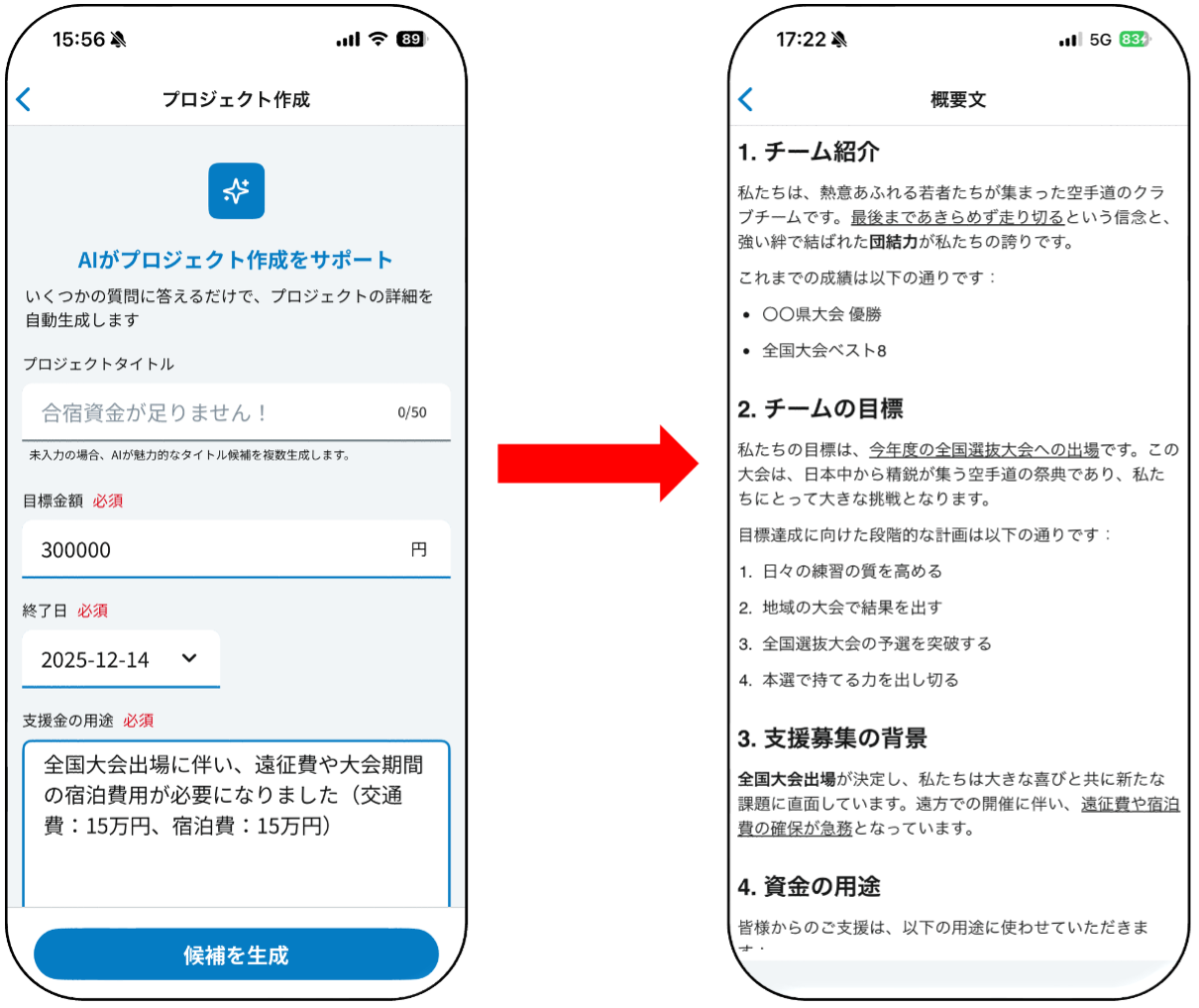 その支援のひとつとして、クラウドファンディングに初めて挑戦するチームでも迷わず準備を進められるようAIがクラウドファンディングページのタイトルや概要文を自動生成する「AIクラファン」機能を提供します。