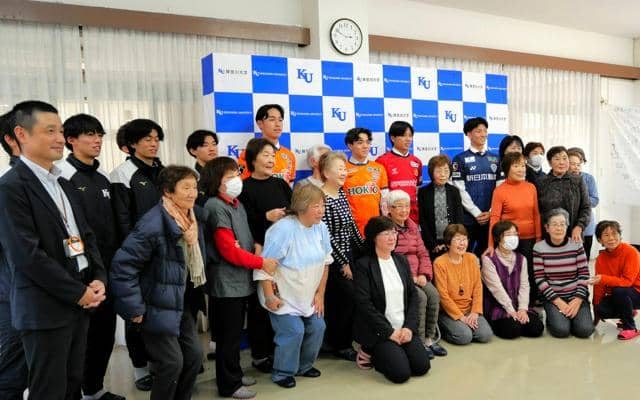 住民の女性は「家族のようにつきあっていただき、試合があれば応援してきた。未来へ飛び立とうとしているので、頑張って上まで飛んでいってください」と語りかけた。会見後は住民と部員たちが一緒に記念写真に納まった。