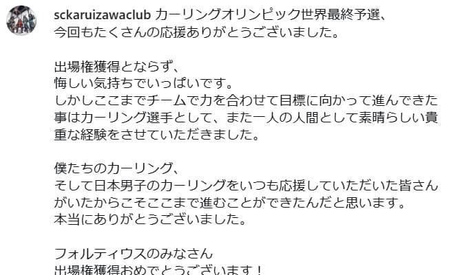 「僕たちのカーリング、そして日本男子のカーリングをいつも応援していただいた皆さんがいたからこそここまで進むことができたんだと思います 本当にありがとうございました」と、あらためて感謝。「フォルティウスのみなさん出場権獲得おめでとうございます! そして小穴青木のミックスダブルスはこれからです! 全力応援します」と締めると「SC軽井沢はさらに強くなってくる!」「みなさま全員の素晴らしい姿に感動しました」「最後までワクワクと感動をありがとう」と、ねぎらいの言葉が贈られていた。