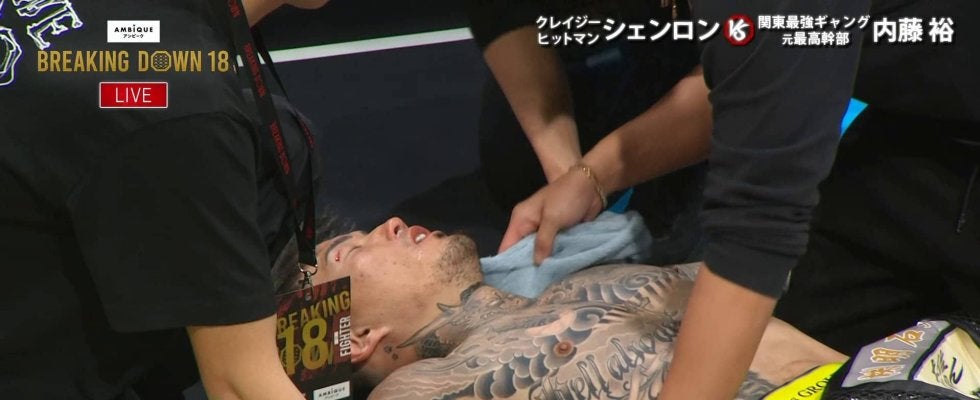 だが延長戦わずか3秒、これまでの試合経験に勝る内藤の右フックがシェンロンの顔面をとらえると、フラフラと後ろに崩れ落ちるようにダウン。なんとか立ち上がったシェンロンだったが、足元は覚束なく、すぐにラッシュで攻め込まれレフェリーストップ。ふたたび倒れ込んだシェンロンは、一時、担架が運び込まれるほどのダメージだった。