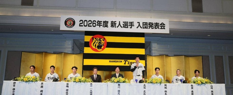 阪神の新人選手入団発表会が15日、大阪市内のホテルで行われた。支配下5選手、育成2選手が真新しいタテジマのユニホームに袖…