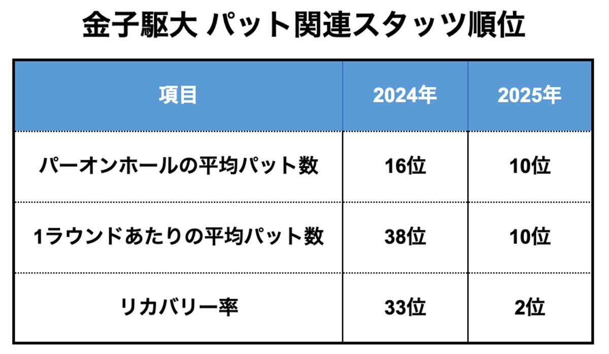 金子は、昨季のトータルドライビング16位、パーオン率11位が示すようにショットの精度は高かったが、パッティングが課題だった。