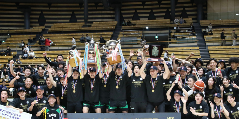 第2クォーターでは相手がファウルドラブルに陥ると、立て続けに得点を奪い32-14で圧倒。その後は相手の3ポイントとハイペースな展開に苦しみ反撃を許した。それでも、わずか2点リードで始まった第4クォーター、小川瑛次郎(2年)が3連続3ポイントを決めて勢いに乗り、守備ではオフェンスファウルを誘って優勝を大きく手繰り寄せる。リードを10点に広げると、佐伯崚介の3ポイント、モンガ バンザ ジョエル(ともに4年)のバスケットカウントで突き放し、歓喜の瞬間を迎えた。
