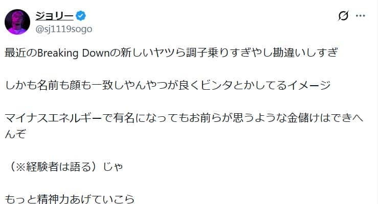 続く投稿では「最近のBreaking Downの新しいヤツら調子乗りすぎやし勘違いしすぎ しかも名前も顔も一致しやんやつが良くビンタとかしてるイメージ」と言及。「マイナスエネルギーで有名になってもお前らが思うような金儲けはできへんぞ (※経験者は語る)じゃ」と助言した。