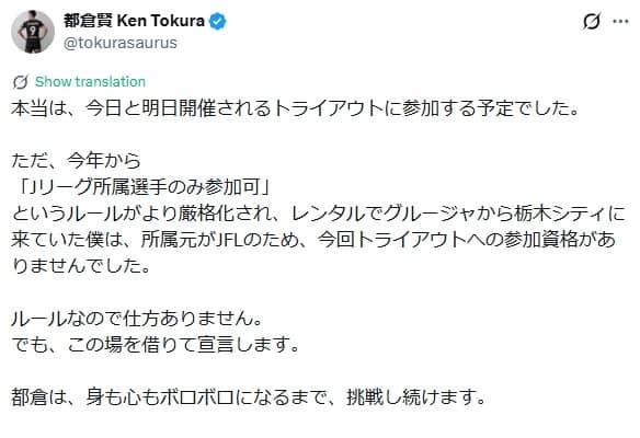 続けて、理由説明。「ただ、今年から『Jリーグ所属選手のみ参加可』というルールがより厳格化され、レンタルでグルージャ(JFLいわてグルージャ盛岡)から栃木シティに来ていた僕は、所属元がJFLのため、今回トライアウトへの参加資格がありませんでした」と記した。