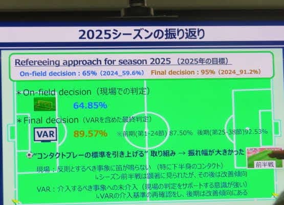 VARが導入されているJ1において、25年はオンフィールド・ディシジョン(OFD=現場での判定)は精度65%(24年は59・6%)、ファイナル・ディシジョン(FD=VARを含めた最終判定)は同95%(24年は91・2%)という目標を設定。前年より約5%の上積みを目指していた。