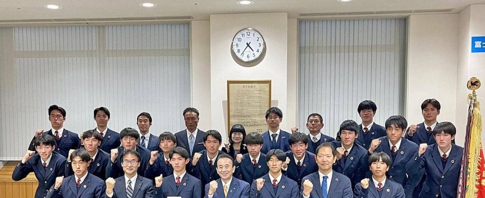 同校は3年ぶり3度目の出場で、冬の全国選手権初勝利を目指す。主将のMF川合亜門(3年)は「静岡代表の誇りを持って戦いたい」とチームの思いを代弁。29日の九州文化学園(長崎)との1回戦に向け、「最高の準備をしたい」と表情を引き締めた。過去2度の出場はともに初戦敗退。鈴木知事は「サッカー王国静岡を勝ち抜いた代表として、堂々と自信を持って試合に臨んでほしい」と激励した。