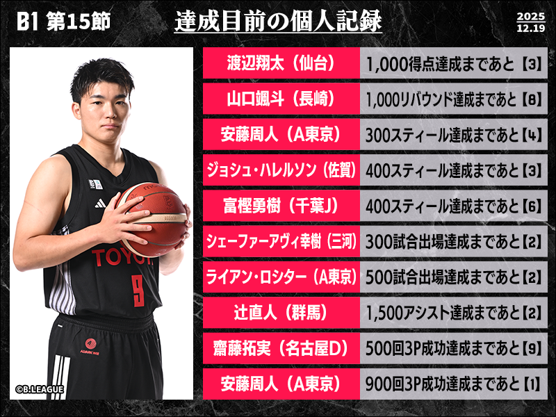 B1リーグ第15節において達成が期待される個人記録をバスケットボールキング編集部がピックアップ。今週末は安藤周人(アルバルク東京)が史上7人目となるB1通算900回3P成功にリーチをかけているほか、過去48人が達成してきた300スティールも射程圏内にとらえている。A東京ではライアン・ロシターも通算14人目となる500試合出場達成が目前に迫っており、記録ラッシュの2連戦となりそうだ。