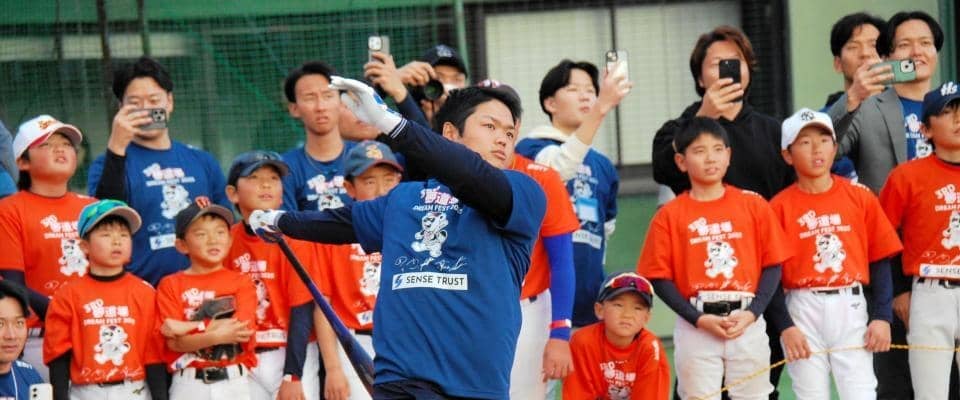 この日は野球教室で子どもたちにキャッチボールなどを指導し、ホームラン対決では8スイング中5本の柵越えを披露。森、藤原の野手にも打ち勝ち、会場を沸かせ「トレーニングが実を結んだ」と笑顔を見せた。