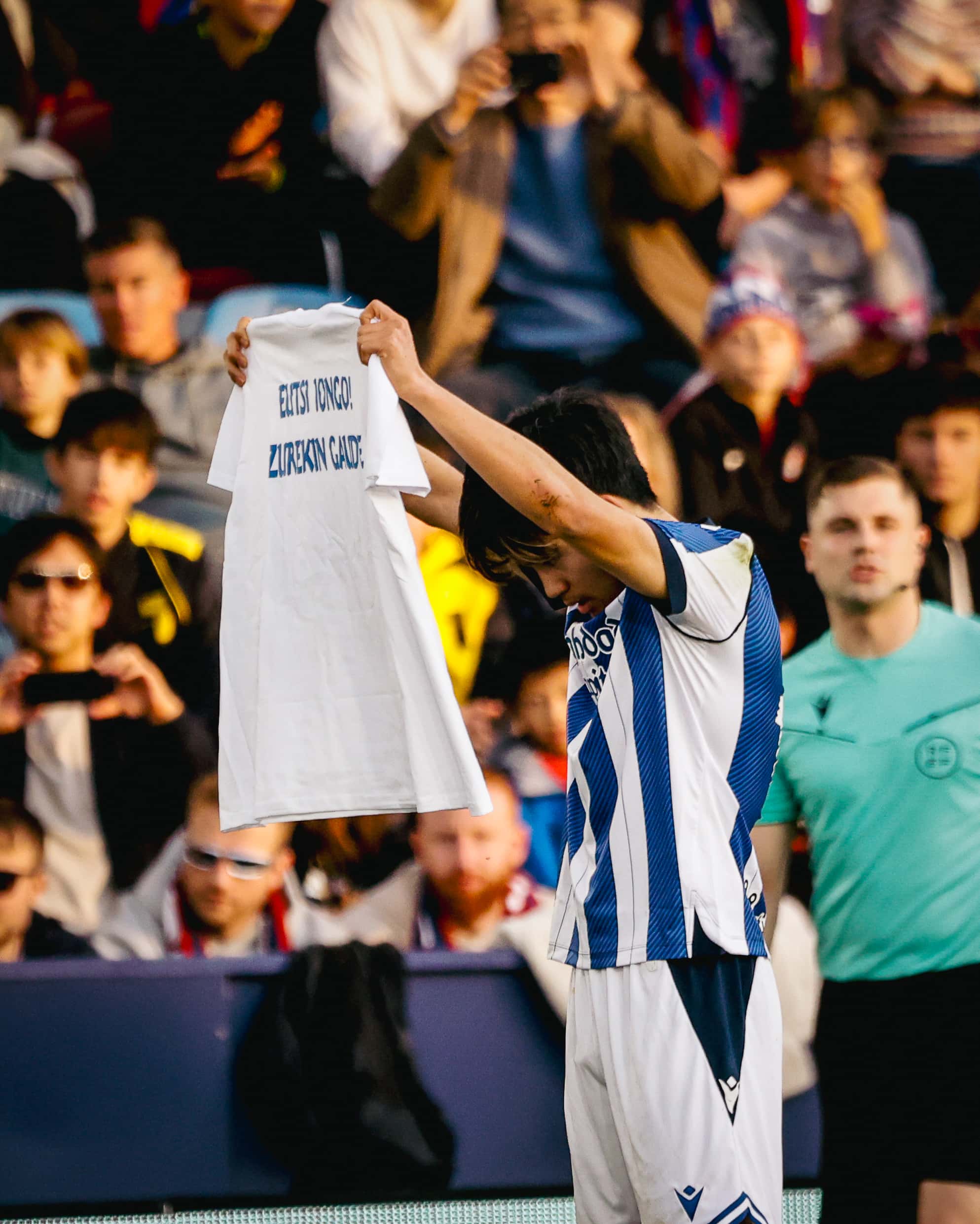 さらに久保は「EUSTI IONGO! ZUREKIN GAUDE(頑張っていこう!僕たちは皆さんと共にある)」と記されたTシャツをサポーターに見せ、メッセージを伝えた。