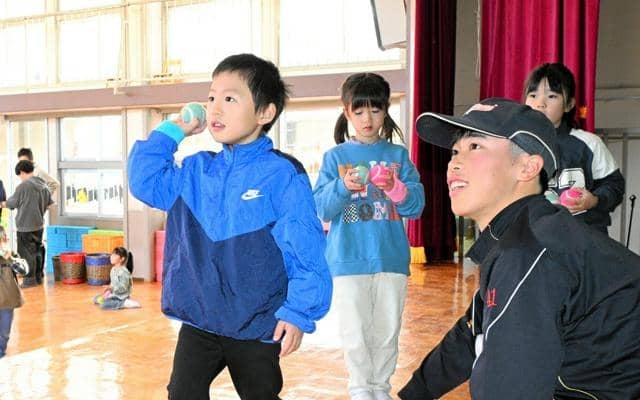 1、2年生の野球部員10人と、園児24人が参加。園児たちは鳥やウサギなどの動きを採り入れた体操をした後、軟らかいボールを使って教わりながら、投げる、打つ、捕るを体験した。
