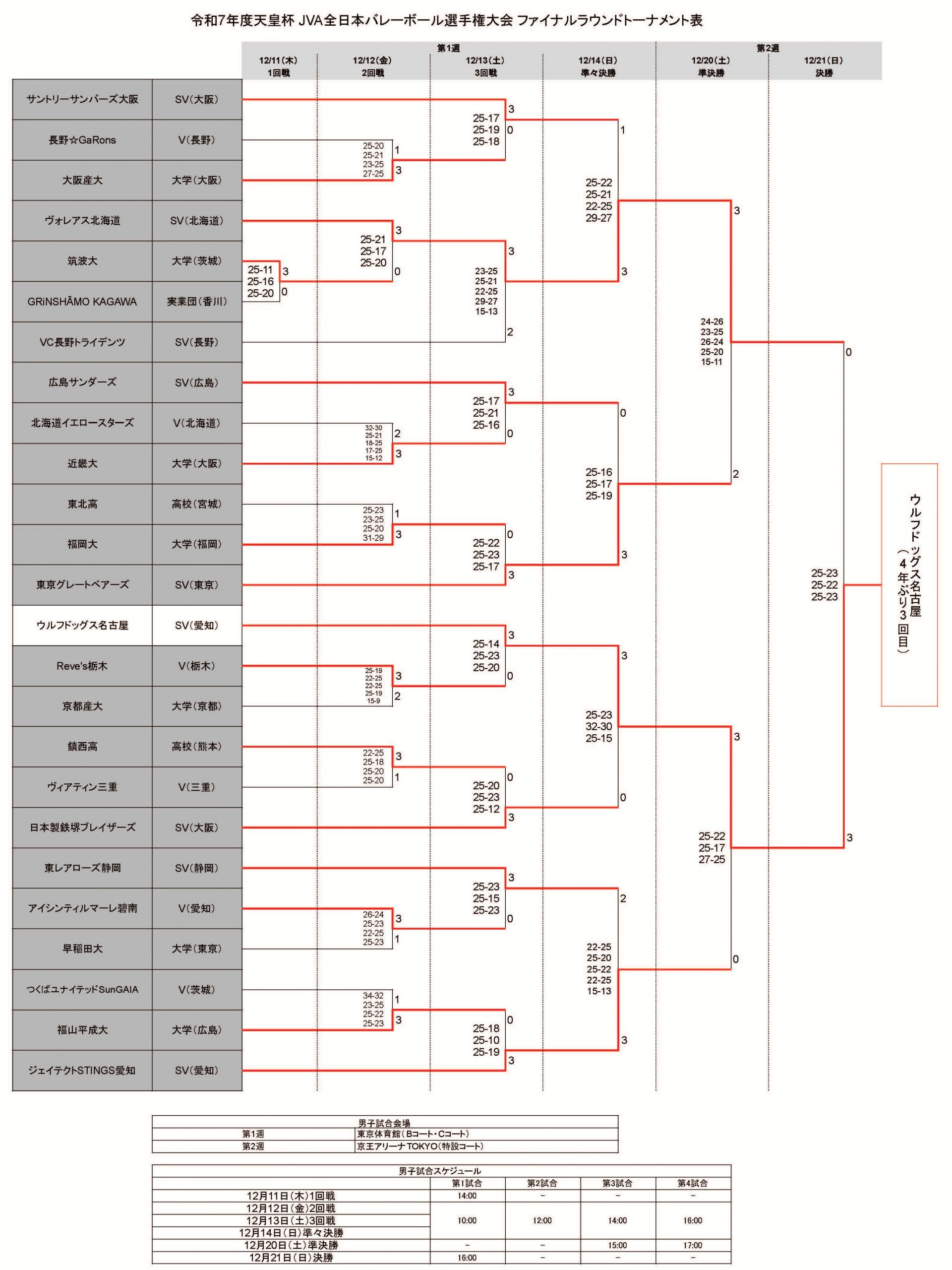 男子決勝は、今大会すべての試合をストレートで勝ち上がってきたウルフドッグス名古屋と、初優勝を目指すヴォレアス北海道が対戦。リーグ戦での2度の対戦は、いずれもフルセットの接戦となり、WD名古屋が2勝している。