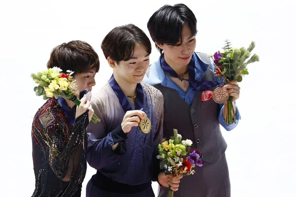 全日本選手権で表彰台に上がった鍵山優真(中央)、佐藤駿(左)、三浦佳生(右)