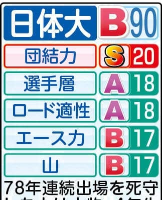 10月の箱根駅伝予選会は9位通過だったが、玉城監督は「関係ない」と全く悲観していない。継続中では最長の78年連続出場は大きな重圧となっていたが、本戦ではプラスに変える。今年度のスローガンは「體進(たいしん)~継承を力に、越境を恐れず~」。「自信と誇りという、伝統の力と切り替えて、戦っていきたい」と指揮官は力強く話した。